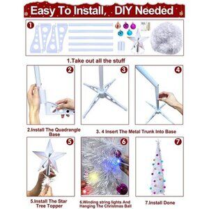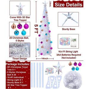 -[ Christmas Tree with 25 Ball Ornaments & Large 3D Star ] The tinsel Christmas Tree comes with an 7.8 inch large 3D star and 25 ball ornaments(5 styles), including 5 two-color spirals balls, 5 rose red matte, 5 rose red shiny, 5 blue matte, 5 blue shiny. The star and balls ornaments need to DIY assemble to the tree.