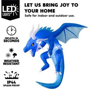 Perfect design. 5 Feet tall blow-up fLying dragon inflatable comes with an extended cord, ground stakes, fastened ropes, and a plug with UL certification. This dragon Halloween inflatable will light up in the evening for the best attraction to neighbors and guests.