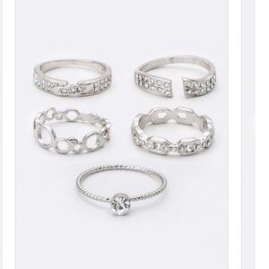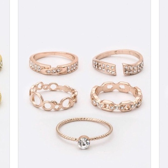 There are 5 little gold tone, silver tone or rose gold tone rings, different sizes, 1 is adjustable. Use altogether or apart. Try one of each.