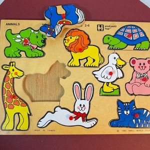 2 wood Small World Toys animal puzzles, one has animal pictures in base