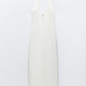 Zara Fitted Halter Dress Fitted midi dress. Halter neck and V-neckline with metal hook detail. Tonal interior lining. Back vent. Hidden in-seam zip closure.