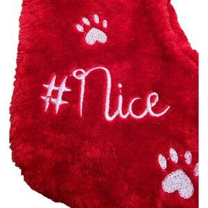 A festive holiday stocking designed for pets, featuring soft red plush material, embroidered paw prints, and white cuff, perfect for holiday treats.