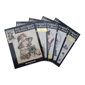 Lot of 5 vintage Stoney Creek cross stitch leaflets from The Saturday Evening Post series. Each leaflet includes a complete pattern with chart and instructions, based on classic Norman Rockwell–era covers. Published in 1992.