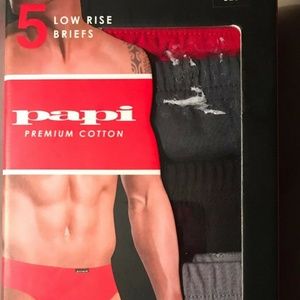 PAPI PREMIUM COTTON, LOW RISE BRIEFS, PACKAGE OF FIVE. PREMIUM COTTON, SOFT TOUCH AND COMFORT FIT. SIZE SMALL. COMES IN ASSORTED SOLID COLORS. PHOTOS REPRESENT SIZE AND STYLE AND MAY NOT BE THE EXACT COLOR SELECTION YOU WILL RECEIVE. PHOTOS ALSO CONTAIN STOCK PHOTOS OF SIZE LARGE. YOU ARE PURCHASING SIZE SMALL.