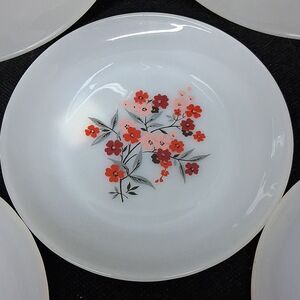 5 pc set Fire King Primrose pattern set of 2 -9" dinner plates and 3- 7" salad plates made by Anchor Hocking from 1960-1962. They are made of white milk glass with a floral pattern featuring pink and red flowers with gray stems. (Some of the plates do have missing portions on their florals due to wear, but this does not affect the use of the plate.) This bundle weighs 5 LBS limit set by Posh per box, so please do not add other items to this box. Thank you.