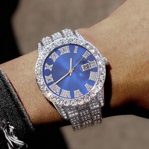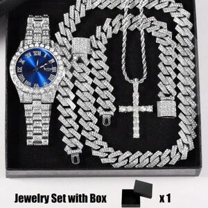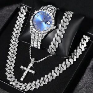 5 Pcs Gift Watch+Cross Pendant Necklace+Bracelet Creative Iced Out Miami Link