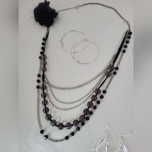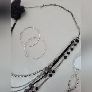 5 piece lot of two necklaces and three earrings. The necklaces are long with black, silver and diamonds and the earrings are two pairs of hoops, one large and thin, one small and thick. And one stunning teardrop diamond dangles. All in good condition, all preowned and have been sanitized with rubbing alcohol.