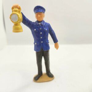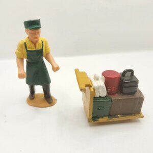 Vintage 5 piece set of German Railroad Worker attendants by LGB. Set includes 4 attendants and a luggage cart that goes with one of the characters (2 separate pieces). One of the characters has a movable arm that is still in working condition.