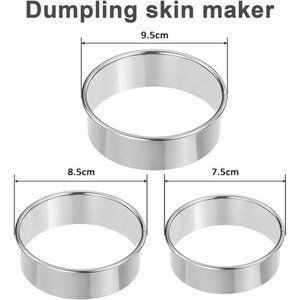 🧿Package includes: 2 pieces dumpling press molds and 3 pieces dumpling skin maker are packed together for your daily using, dumpling press molds have 2 size, 3.7 inch/ 9.5 cm and 3.0 inch/ 7.5 cm in inner diameter, dumpling skin makers have 3 size, large diameters is 3.7 inch/9.5 cm, medium diameters is 3.3 inch/ 8.5 cm and small diameters is 3.0 inch/ 7.5 cm, please confirm the size before ordering