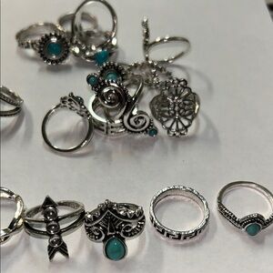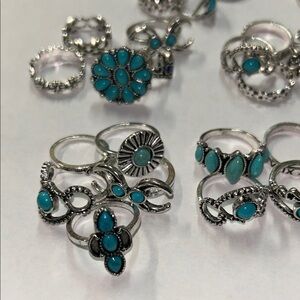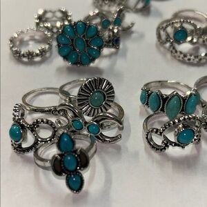 Set of silver-tone bohemian rings featuring turquoise accents. Versatile stackable designs with floral, swirl and geometric details. Lightweight and stylish for everyday wear. Includes multiple turquoise-colored rings for layered looks.