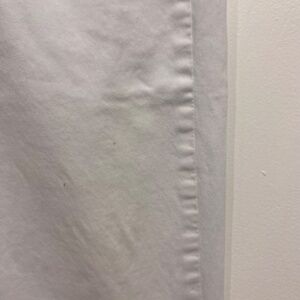 White capri pants with cutout floral hems. There is a faint stain, shown in the photos. I haven't tried any laundry tricks to get it out, so it might come out easily.