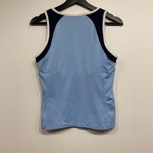 Blue workout tank top with scoop neck and black details. Stretchy material. Perfect for any workout. Size medium. In excellent condition.