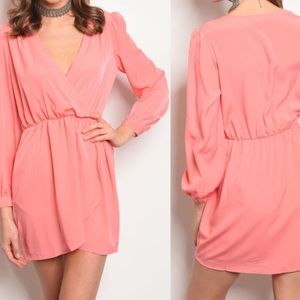 Long sleeve smock waist surplice front wrap dress