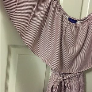 Burgundy and white vertical stripes with attached slip and belt with 2 splits to show off those summer smoothed legs. This dress is gorgeous and was never worn due to the attached slip is very narrow. The dress is a size 12 but the slip is not. I couldn’t get the attached slip over my hips😂.