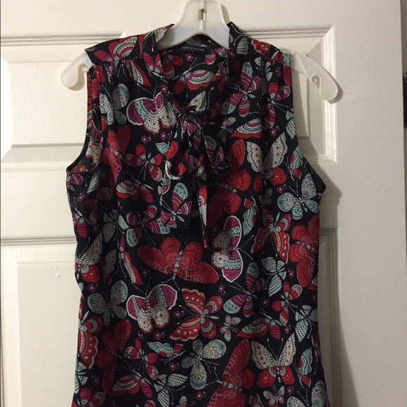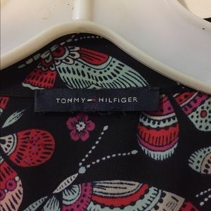 Sheer bow tie blouse-butterfly pattern on a black background by Tommy Hilfiger. The blouse is DYNAMITE 🧨 paired with some mom jeans with a pair of chucks; dark or white denim skinny jeans with your summer sandals with a heel or a pencil skirt with pumps.