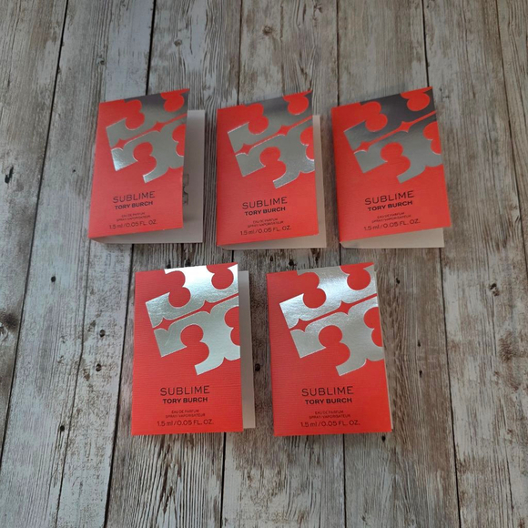 This is a set of five Tory Burch Sublime sample vials. Each vial contains 1.5 ml / 0.05 FL OZ . The vials are housed in bright orange paper sleeves with a silver Tory Burch logo. The vials are clear glass with black caps. The items are new without tags or box.