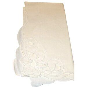 These vintage white linen napkins feature exquisite floral embroidery and scalloped edges, adding a touch of elegance to table settings for formal gatherings.