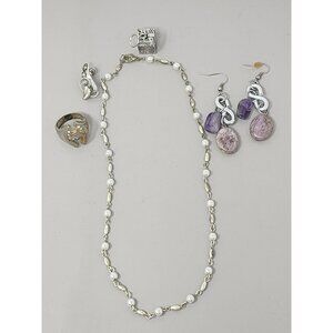 5 Vintage Silver Costume Jewelry Ring/Faux Pearl Necklace/Charm/Earrings