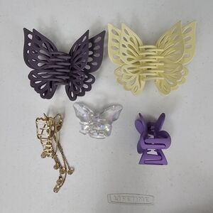 Set of butterfly and flower hair clips in purple, cream, gold, and iridescent colors. Perfect for adding a stylish touch to any hairstyle.