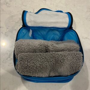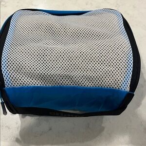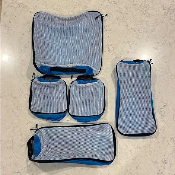 5 gently-used packing cubes from ebags. You’ll get 2 slim cubes (measuring 13x6.5x3.5in) and 2 small cubes (measuring 6.5x6.5x3.5in) and 1 Large cube (measuring apx 12x12 in) .