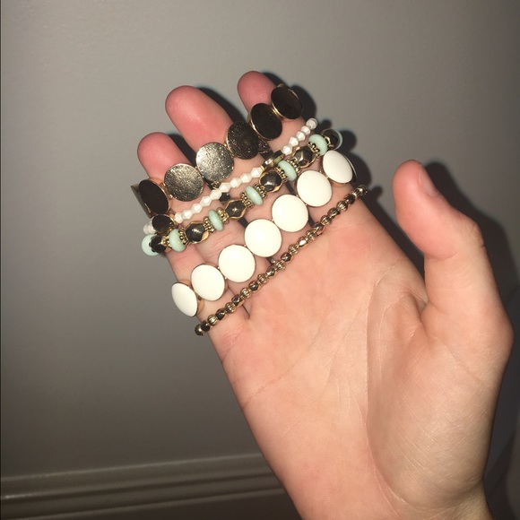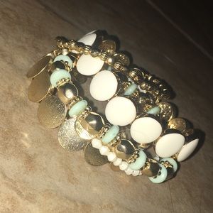2 gold bracelets. 2 white bracelets. 1 blue and gold bracelet. only worn once