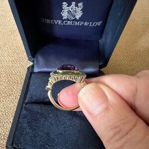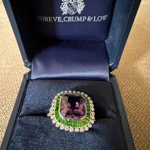 This beautiful estate piece is a five karat amethyst set in 18 karat gold surrounded by diamond and garnet. Purchased from Shreve, Crump and low, with insurance valuation attached. Size 6