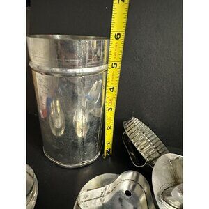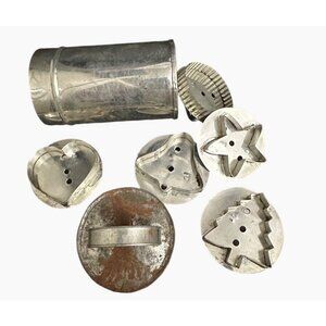 This vintage metal flour shaker comes with 5 unique,cookie cutters , perfect for various baking and decorating needs. Its sturdy construction ensures durability, while the charming, rustic look adds a touch of nostalgia to your kitchen. The tins compact size makes it easy to store, and the designs include heart, star, and tree shapes for festive baking.