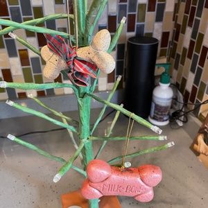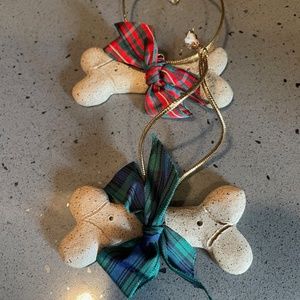 There are 3 "Milk Bone" ornaments in 3 different colors brick red, brown and green. I think they are ceramic. Measure approximately 3.25" x 1.75" x .75".