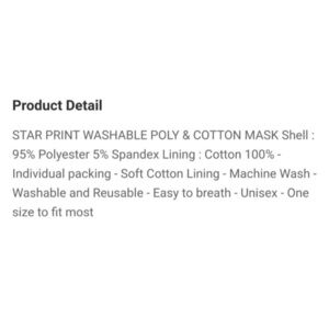 Star print brown color with white stars and black trim, this face mask features soft cotton lining, is machine washable and reusable.