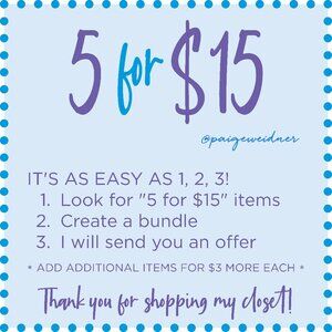 Bundle any 5 qualifying listings titled “5 for $15”. Add additional items for just $3 more per qualifying item OR make me an offer for this single listing.
