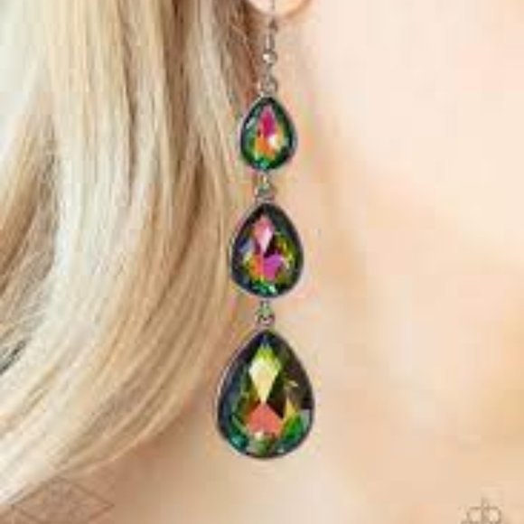 Featuring sleek gunmetal frames, exaggerated oil spill teardrop rhinestones gradually increase in size as they drip from the ear. Earring attaches to a standard fishhook fitting.