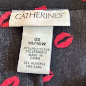 Black with red polyester and spandex. Button front. Sleeves are cuffed. Approx. armpit to armpit measure is 24 inches. Approx. length is 29 inches.