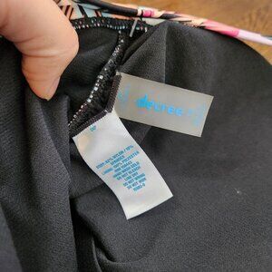 Decree One-Piece Bathing Suit. Black with all over tropical floral print. Removable cup inserts. Adjustable straps. Criss cross strap detail at hip.
