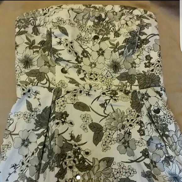 Beautiful Old Navy White and Grey Floral Strapless Dress, tried on a few times but never worn for more than an hour! Comes from a smoke and pet free home. The dress is a size 2, but has an elastic panel in the back of the dress that might stretch to a size 4. The dress also has a rubber lining along the top to prevent any slippage, a hidden side zipper and a metal clasp above it.