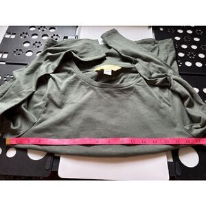 ROEBECK & CO women’s size S army green long sleeve knotted front top. Preloved but in good condition. No defects or flaws. The top is made from a soft and stretchy fabric and features a relaxed fit. The twist front detail adds a touch of style, and the long sleeves will keep you warm on cooler days.