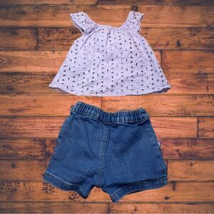 Adorable baby girl outfit set in size 0-3 months, featuring a 7 For All Mankind blouse paired with matching Garanimals shorts. The blouse offers a soft, stylish look while the coordinating shorts provide all-day comfort—perfect for warm weather outings or casual days. Gently used and in excellent condition—sweet, comfy, and fashion-forward for your little one!