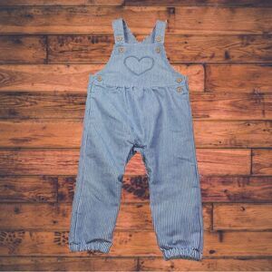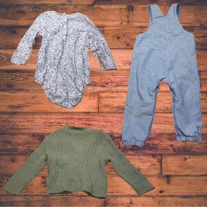 Adorable 3-piece matching set for babies size 18 months, featuring a pair of overalls, a cozy sweater, and a coordinating snap-bottom top. Perfect for layering and keeping your little one warm and stylish. Please note: the top has a small flaw on the sleeve—see pictures for details. Gently used and overall in great condition, this set is ideal for everyday wear or special outings!