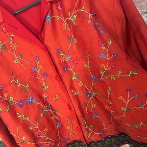 The New Directions Floral Embroidered Cottage Core Orange Shacket (Shirt/Jacket) in size Medium is a charming and versatile piece that blends the coziness of a jacket with the lightweight feel of a shirt. Made from a soft, durable fabric, this shacket features beautiful floral embroidery that captures the essence of the cottagecore aesthetic, bringing a rustic, feminine touch to your wardrobe. The rich orange color adds a warm, vibrant pop, while the relaxed fit ensures comfort and easy layering over your favorite tops. The button-front design allows for versatile styling, whether worn open as a lightweight jacket or buttoned up as a shirt. Please note, this shacket has a couple of small discolorations on the sleeve, as shown in the pictures, but it still retains its unique, stylish appeal. Perfect for adding a cozy yet chic layer to your outfits, this shacket is a must-have for those who love casual, vintage-inspired fashion.