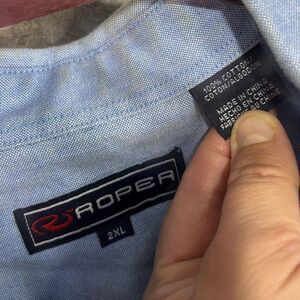 The Roper Sky Blue Button Front Shirt in size 2XL offers a classic, comfortable fit with a stylish touch. Crafted from soft, breathable fabric, this shirt is perfect for casual or semi-dressy occasions, providing both comfort and a refined look. The button-front design and collar give it a timeless appeal, while the sky blue color adds a refreshing pop to your wardrobe. Please note, this shirt has a couple of small flaws, as shown in the pictures, but it still offers great style and wearability. Whether paired with jeans, shorts, or chinos, this Roper shirt is a versatile addition to your collection.