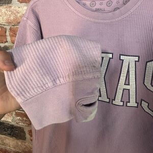 The Three Square by Royce Apparel TEXAS Mauve Long Sleeve Ribbed Shirt in size Small combines casual comfort with a touch of southwestern style. Featuring a soft ribbed texture and a bold "TEXAS" graphic, this shirt offers a flattering, fitted silhouette with long sleeves, making it perfect for layering or wearing on its own. The mauve color adds a warm, earthy tone that pairs easily with jeans or leggings for a relaxed, everyday look. Please note, this shirt has a couple of small flaws on one sleeve, please see pictures for details. Despite these minor imperfections, it's still a great addition to your casual wardrobe. Ideal for cooler weather or casual outings, this shirt brings a bit of personality and style to your wardrobe.