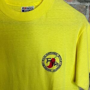 Please note, this t-shirt has a logo that says Taco Flats San Antonio Style Mexican Cuisine on the left side of chest, please see pictures. This shirt also has a couple of small spots, please see pictures for these as well.