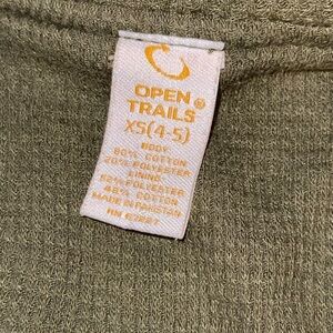 Keep your little one warm and stylish with this Open Trails camo zip-up hoodie. Featuring a classic camouflage pattern, this hoodie is perfect for outdoor adventures or everyday casual wear. Made from a comfortable cotton-polyester blend, it provides both durability and coziness. The full zipper makes it easy to layer, while the hood offers added warmth on chilly days. Designed in size XS (4-5), this hoodie is an excellent choice for any young explorer looking to stay comfortable and on-trend.