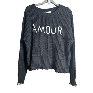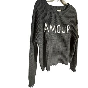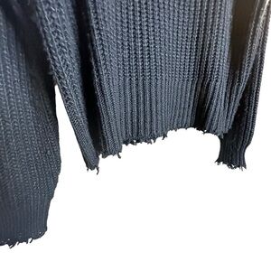 GB Amour Black Round Neck Long Sleeve CableKnit Frayed Hem Pullover Sweater sz M