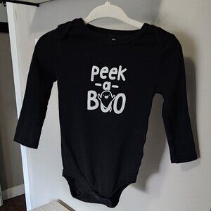 Pumpkin pattern, Peek a Boo, and Pumpkin Spice onesie are made by Joe Fresh and are 100% organic cotton