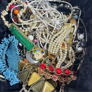 5 pounds of craft jewelry. Photos are examples of what you can find. This is designed to draw upon your creative side. Fixing jewelry and making jewelry and art or using beads to make things is the main reason I create these bags. This is saving beads from getting thrown away because they can be reused and made into other beautiful things! This is 5 pounds of miscellaneous bits and parts of jewelry that I will scoop from a tub of hundreds of pounds of craft jewelry!!! There are some wearables but the majority of this is for repurposing and re-creating art and other jewelry. Other folks break apart the jewelry and make new jewelry or reset missing stones or fix broken jewelry etc. None of this will be cleaned or untangled it’s just a bunch of jewelry with most of it broken and unmatching. This is for repurposing , harvesting, artwork and crafting. Because of the weight of this item, it cannot be bundled with any other items in my closet. This box will be 5 pounds of Vintage to current beads, jewelry, and findings for repurposing.