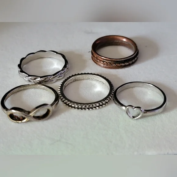 set of 5 rings various metals and patterns I'd say size 6 or 6.5 i wear a 7 and they're just a bit small open to offers