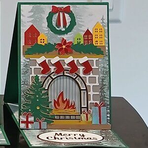 Add a warm, festive touch to your holiday greetings with this beautiful set of 4 handmade Christmas Cards. Each card features a charming fireplace scene complete with: