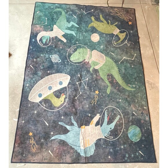 Dinosaurs in Space Ruggable rug cover only 5 x 7 feet. This is in really great condition. Washed one, the edges are NOT curling and there are no stains.