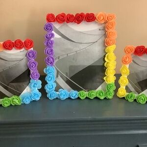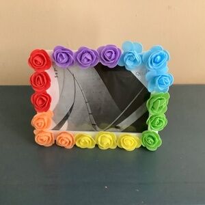 This is a listing for a handmade 5” x 7” real touch multi colored rainbow rosebud picture frame.