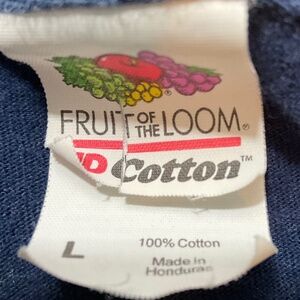 Made with 100% cotton by Fruit of the Loom, this navy blue shirt perfect for any fan or collector. Size Large, unisex fit. See approximate measurements